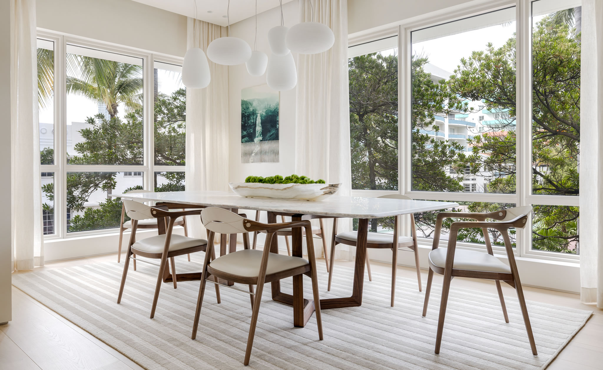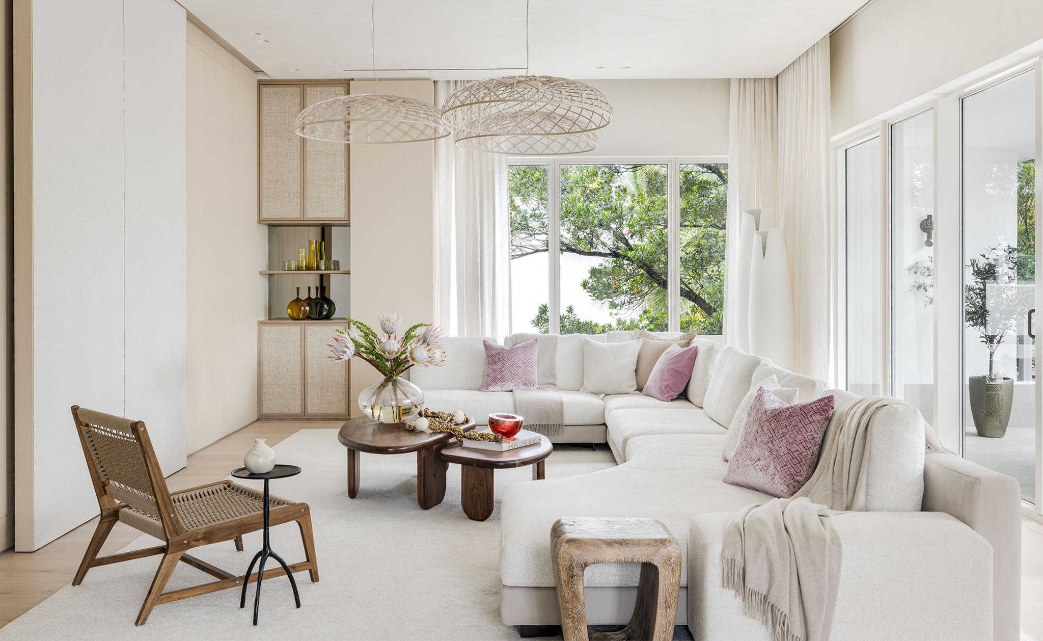The execution of this residence reflects Troy Dean Home’s fully integrated design-build approach, where architecture, interior design, construction, and millwork operate seamlessly under one roof. European oak flooring runs throughout, grounding the space with warmth and continuity, while custom millwork—crafted in soft, tonal hues—was designed to blend effortlessly with the architectural envelope. An open layout and sheer window treatments maximize natural light, enhancing the connection between interior spaces and the surrounding tropical landscape. Layered lighting—recessed, ambient, and accent—was carefully orchestrated to add depth and softness, ensuring every moment of the day is supported by the right atmosphere. Precision, craftsmanship, and restraint define the construction process, resulting in a home where function and refinement coexist naturally.